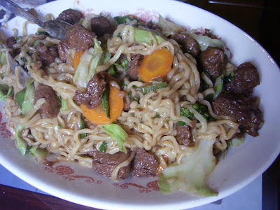 Em uma panela grande, adicionar nessa ordem, 2 colheres de sopa de óleo, a cebola, os pimentões, a cenoura, o repolho, o brócolis e o amendoim e vai refogando e mexendo. Depois acrescenta a pvt já refogada previamente, e os legumes devem ser refogados em 4 min. Passados os 4 min, acrescentar o macarrão já escorrido, e misturar tudo e jogar o molho de shoyo que estava reservado. É só servir.