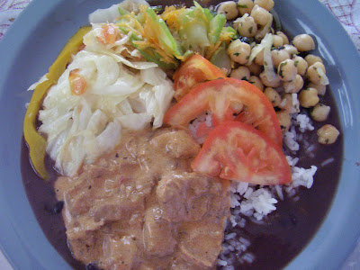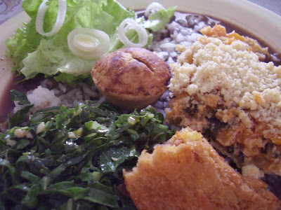 Feijão, arroz branco, repolho refogado com cebola e pimentão amarelo, chuchu com cenoura refogados, grão de bico refogado com cebola e cheiro verde, estrogonofe de soja com creme de leite de soja e tomate cru.